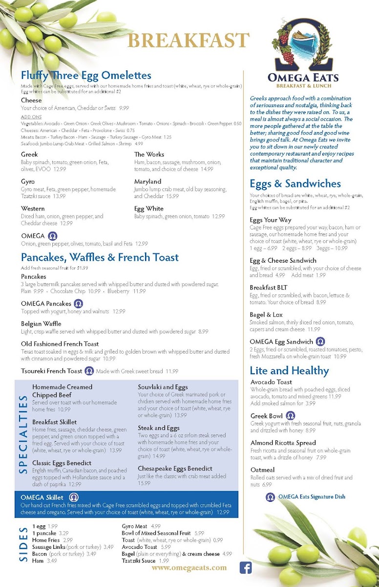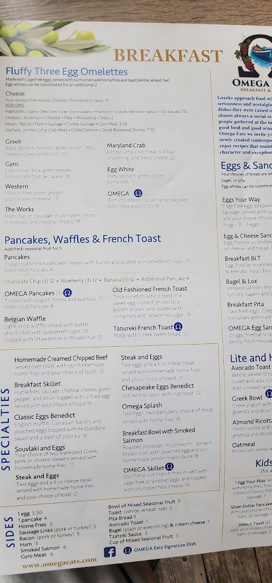 Welcome to Omega Eats, Breakfast & Dinner, a delightful gem nestled in Ocean City, MD. This inviting eatery specializes in serving hearty breakfast and dinner options that cater to all appetites. Guests can indulge in a variety of Pancakes, Waffles, and French Toast dishes, including the delectable Old Fashioned French Toast and unique flavored pancakes like Chocolate Chip and Blueberry. For something savory, try the Homemade Creamed Chipped Beef or the robust Steak and Eggs, perfectly paired with homemade home fries.